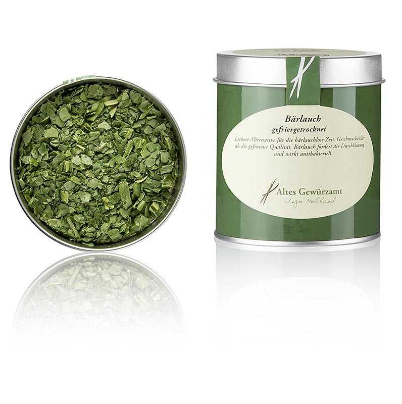 Das spezielle Verfahren der Gefriertrocknung erhält sowohl die Farbe als auch das intensive Aroma. Mit etwas Flüssigkeit erreichen Sie fast den Zustand frischen Bärlauchs zurück. Er schmeckt milder als Knoblauch. Verwendung: Ausgezeichnet für Salat- , Joghurt- oder Sahnesoßen, Spinat, Kartoffelgerichte mit Eiern, Risotto mit Spargel sowie Suppen geeignet.