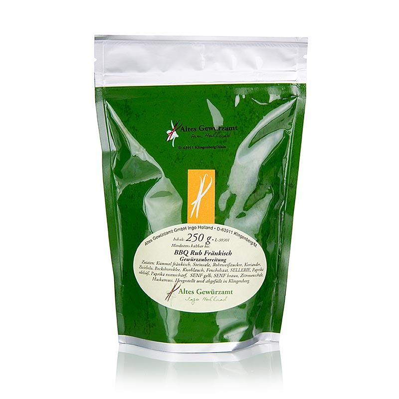 Gewürzzubereitung. Zutaten: Kümmel fränkisch, Steinsalz, Rohrweißzucker, Koriander, Zwiebeln, Bockshornklee, Knoblauch, Fenchelsaat, SELLERIE, Paprika edelsüß, Paprika rosenscharf, SENF gelb, SENF braun, Zitronenschale, Muskatnuss. 250 g Rub reichen für 6 - 9 Kg Fleisch. Kühl, trocken und lichtgeschützt lagern. Eigenschaften: Es müssen keine Nährwerte angegeben werden.