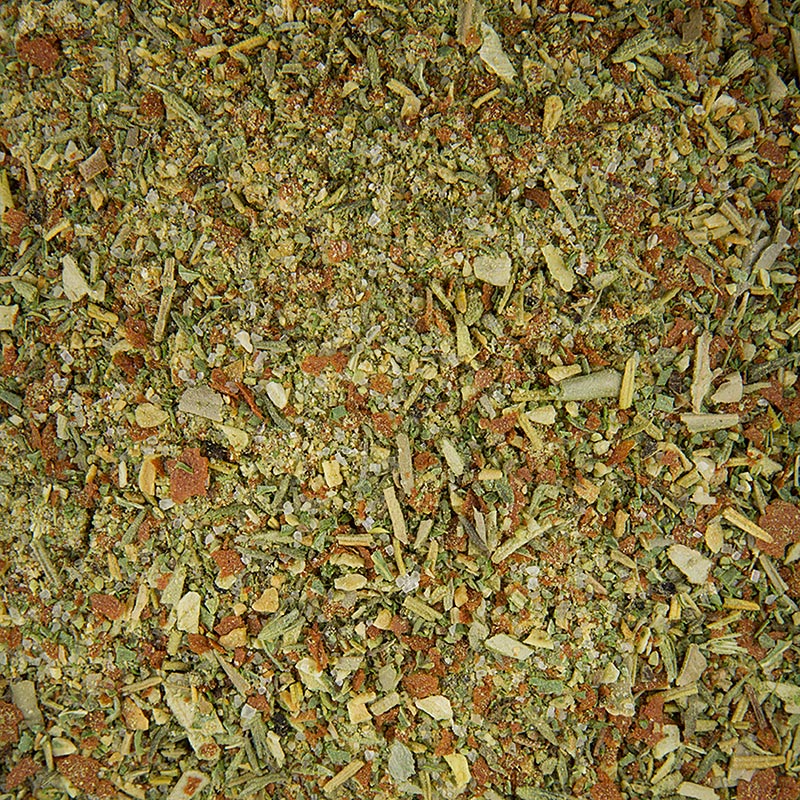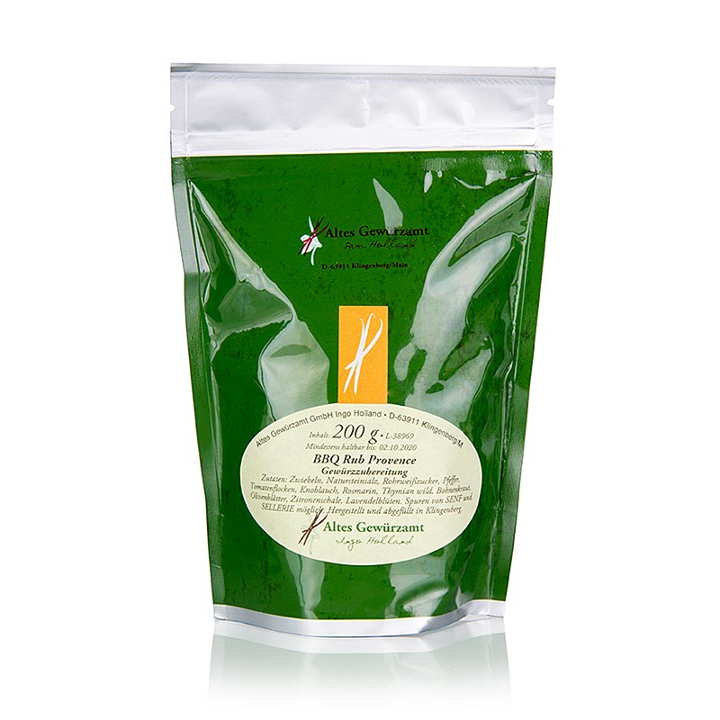 Gewürzzubereitung. Zutaten: Zweibeln, Natursteinsalz, Rohrweißzucker, Pfeffer, Tomatenflocken, Knoblauch, Rosmarin, Thymian wild, Bohnenkraut, Olivenblätter, Zitronenschale, Lavendelblüten. 200 g Rub reichen für 4-6 Kg Fleisch. Fleisch marinieren und 12-18 Stunden kühlen. Kühl, trocken und lichtgeschützt lagern. Eigenschaften: Es müssen keine Nährwerte angegeben werden.