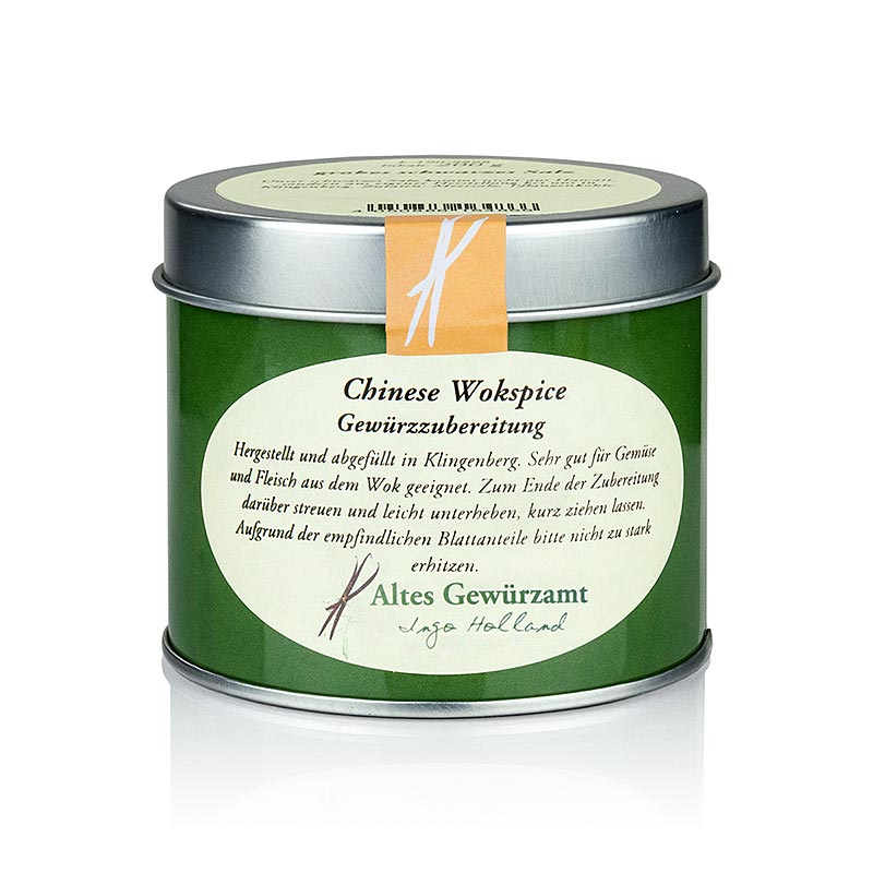 Gewürzmischung "Chinese Wokspice". Zutaten: Röstzwiebeln (Zwiebeln, Palmöl, Buchweizenmehl, Salz), Pfeffer, Knoblauch, Chili, Szechuanpfeffer, Paprika, Süßholz, Ingwer, Sternanis, Koriander, Fenchel, Zimt, Zitronengras, Korianderblätter, Kardamom, Gewürznelken. Eigenschaften: Es müssen keine Nährwerte angegeben werden.