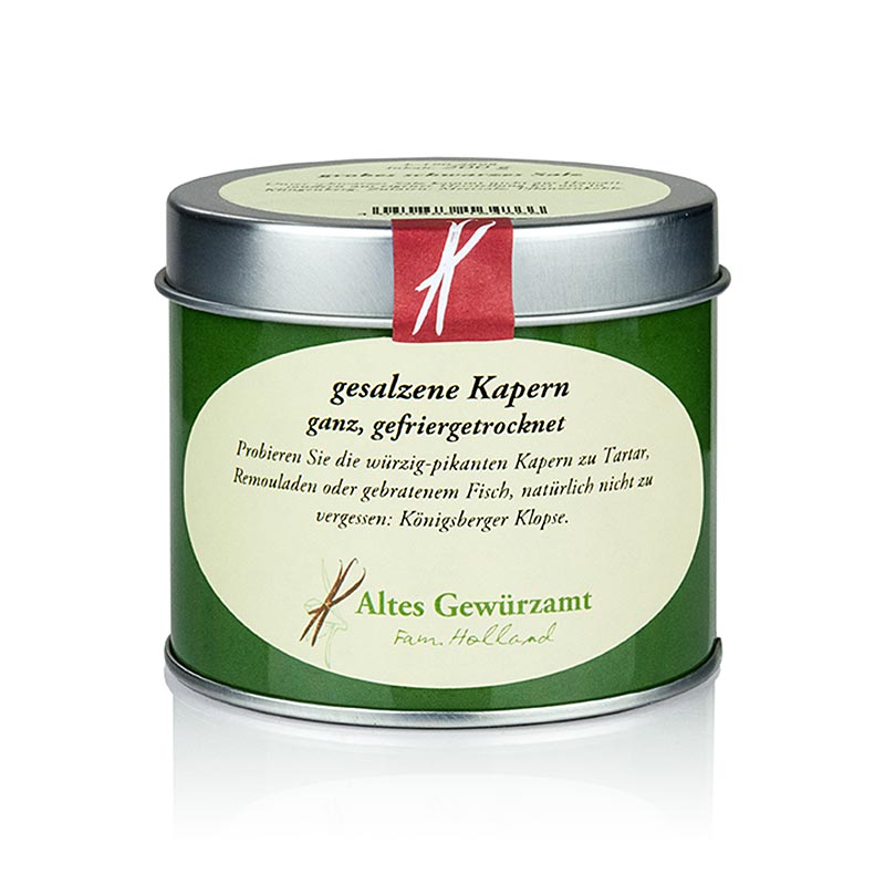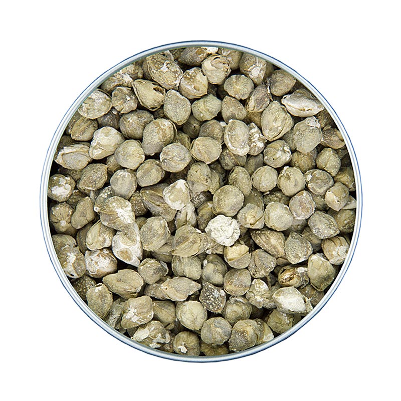 Ganze Kapern, gesalzen, gefriergetrocknet. Zutaten: Kapern, Salz. Kühl, trocken und lichtgeschützt lagern. Eigenschaften: Es müssen keine Nährwerte angegeben werden.