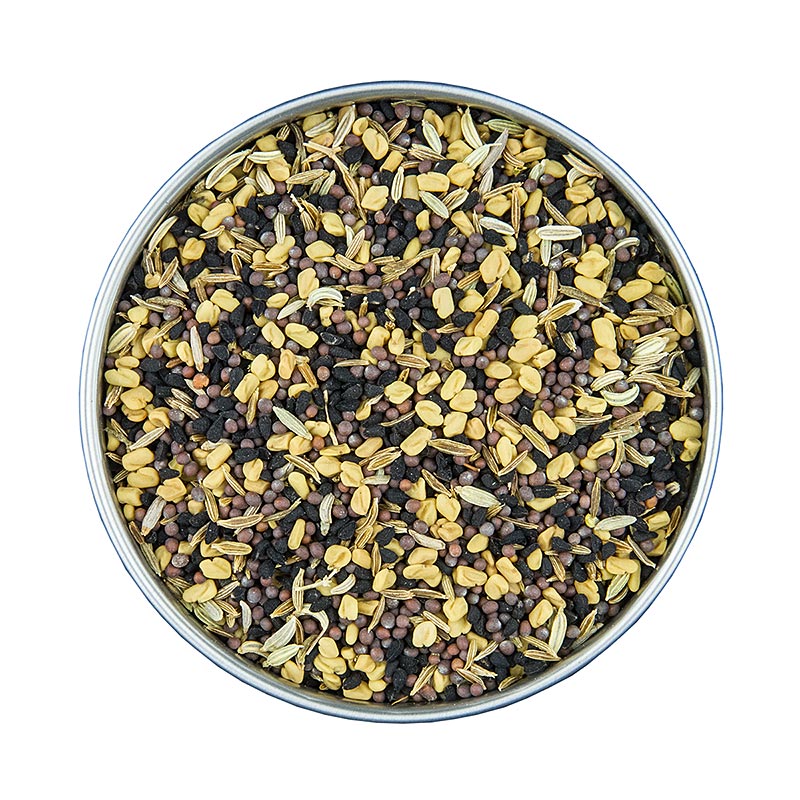 Eine klassische nordindische Gewürzmischung, bestehend aus 5 verschiedenen Gewürzen: braune Senfsaat, Nigella (Schwarzkümmel), Fenchelsamen, Kreuzkümmel und Bockshornkleesamen. Die Aromen werden dem Gewürz durch z.B. erhitzen in Öl entzogen. Oder kochen Sie das Gewürz in einem Sud aus und benutzen es zum pochieren. Für Ragouts, das Gewürz in einem Säckchen geben und auskochen lassen.