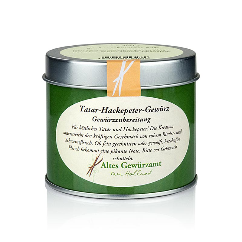 Gewürzzubereitung "Tatar Hackepeter". Zutaten: Salz, Paprika, Tomatenflocken, Kapern (Kapern, Salz), Zucker, Pfeffer schwarz, Zwiebeln, Salz geräuchert, Chili, SENF, Knoblauch, Kubebenpfeffer wild, Wacholder, Bärlauch, Schnittlauch. Kühl, trocken und lichtgeschützt lagern. Hergestellt und abgefüllt in Klingenberg, Deutschland. Eigenschaften: Es müssen keine Nährwerte angegeben werden.