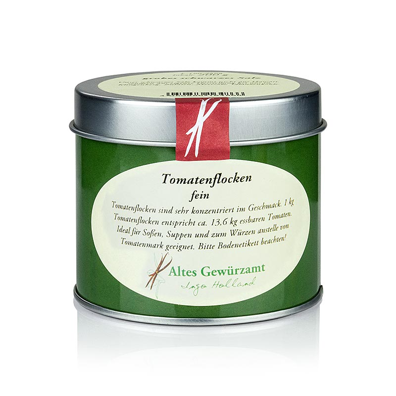 Tomatenflocken, fein. Enthält ein Trockenton-Kissen. Das Kissen nicht öffnen, nicht essen! Eigenschaften: Es müssen keine Nährwerte angegeben werden.