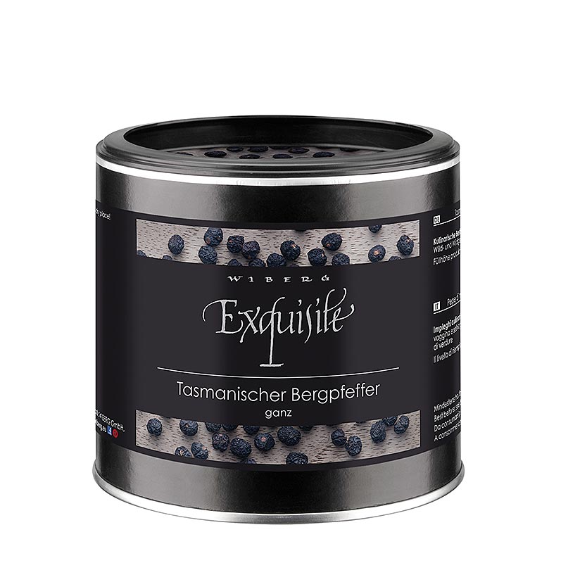 Wiberg Exquisite Tasmanischer Bergpfeffer: Im sehr wechselhaften südpazifischen Klima gedeiht dieser außergewöhnliche Pfeffer auf der Insel Tasmanien. Er zeichnet sich durch das unglaublich würzig-fruchtige Aroma, gefolgt von einem scharfen pfeffrigen Geschmack aus. Die feine Baumpilznote und der erdige, leicht nelkenähnliche Geschmack machen den Reiz dieser Beeren aus. Zarter Zedernholzduft rundet diese Rarität ab. Kulinarische Bestimmung: kräftig Fleischgerichte, Wild- und Wildgeflügel sowie Gemüse-Variationen.