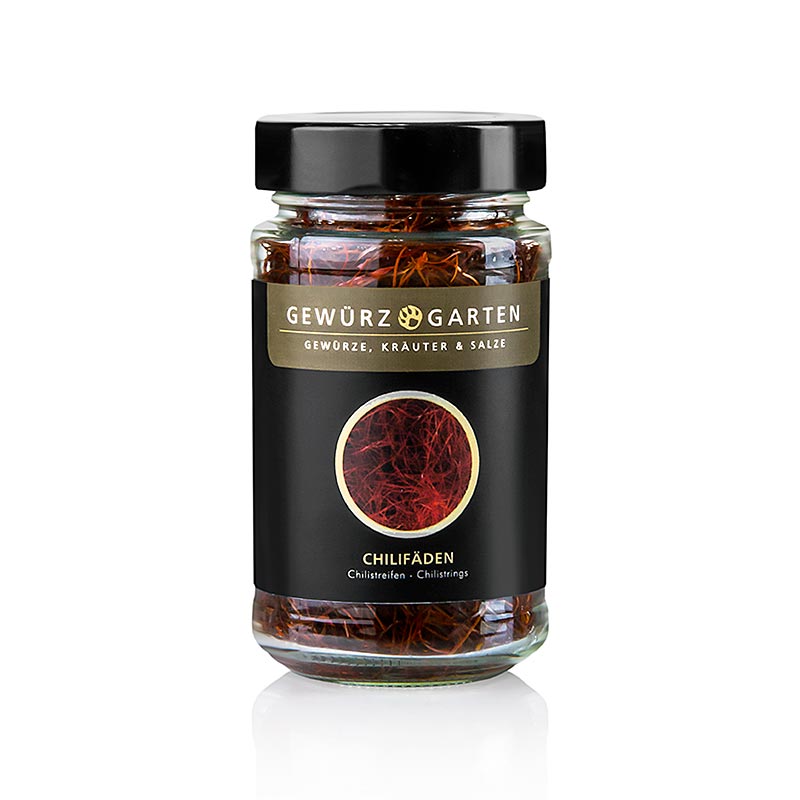 Chilifäden. Zutaten: Chili. Trocken und lichtgeschützt lagern. Eigenschaften: Es müssen keine Nährwerte angegeben werden.
