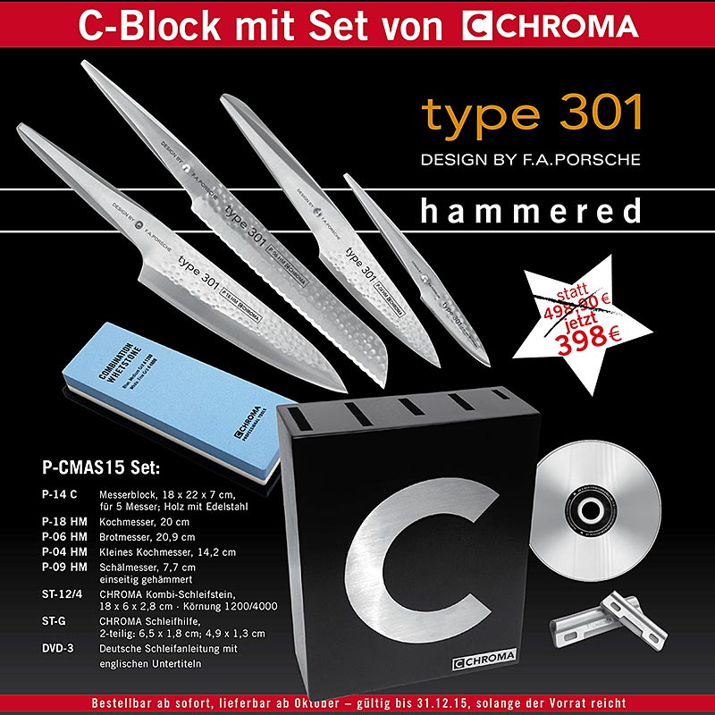Alle Messer sind von der Marke Chroma aus der Serie „type 301“ -design by F.A. Porsche. · P-14C Messerblock, 18x22x7 cm, für Messer; Holz mit Edelstahl · P-18 HM (HM für Hammerschlag) Kochmesser, 20cm · P-06 HM Brotmesser, 20,9cm · P-04 HM kleines Kochmesser, 14,2cm · P-09 HM Schälmesser, 7,7cm, einseitig gehämmert · ST-12/4 Chroma Kombi-Schleifstein, 18x6x2,8cm, Körnung 1200/4000 · ST-G CHROMA Schleifwinkelhilfe, 2-teilig, 6,5x1,8cm, 4,9x1,3 cm · DVD-3 Deutsche Schleifanleitung mit englischen Untertiteln auf DVD