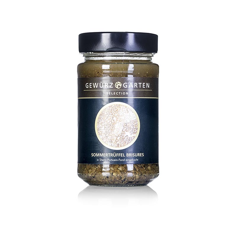 Für diese Brisures werden fein gehackte Sommertrüffel (tuber aestivum/unicinatum) in einem Fond aus Sherry, rotem Portwein und Geflügelbrühe eingekocht. Bestens geeignet zur Weiterverarbeitung in dunklen Saucen, Dressings und Suppen. Abtropfgewicht: 100g