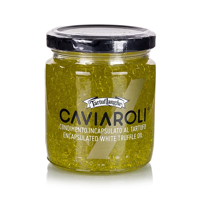 Olivenöl Perlen mit weißem Trüffelaroma. Zutaten: 96% extra natives Olivenöl, Wasser, Verdickungsmittel: E401, weißes Trüffelaroma, Trennmittel: E500, Säureregulator: E330, Konservierungsmittel: E202. Kühl, trocken und lichtgeschützt bei +10°C bis max. +26°C lagern. Nach dem Öffnen im Kühlschrank aufbewahren, und innerhalb von einem Monat verbrauchen. Produkt aus Spanien.