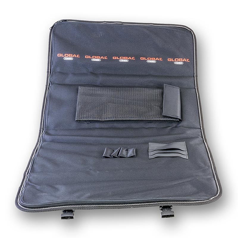 Mit Hilfe der Messertaschen aus dem Global Programm sind Ihre Global-Messer sicher und jederzeit griffbereit - auch für unterwegs - untergebracht. Die G-667/21 Messertasche aus Nylon, ist für Profis als feste, faltbare Mappe, mit zusätzlicher Schutzlasche innen sowie mit Klickverschlüssen, Tragegriff und Tragegurt gefertigt. Die Tasche bietet einundzwanzig Fächer für jeweils ein Messer und zusätzlich Platz für Visitenkarten oder Stifte. Maße: 52 x 22 x 7,5cm
