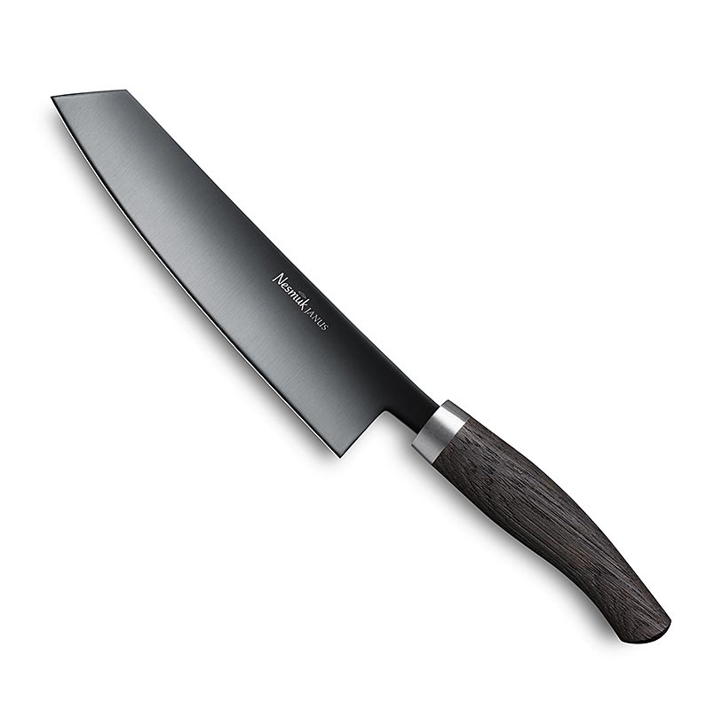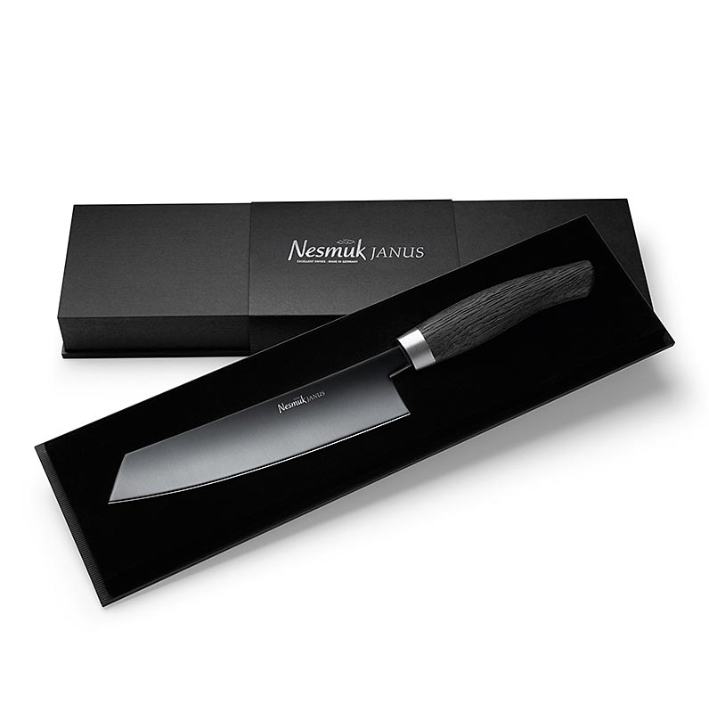 Das Janus 5.0 verbindet das handwerkliche Können und die langjährigen Erfahrungen von Nesmuk. Die 4mm starke und 180mm lange Kochmesser-Klinge aus rostbeständigem Hochleistungsstahl mit Niobanteil, die hervorragende Schneidperformance und höchste Zähigkeit bietet, ist durch eine hochwertige DLC- Beschichtung (Diamond-like Carbon) veredelt. Diese zeichnet sich durch enorme Härte (2.300 Vickers), niedrige Reibwerte und hohe Haftfestigkeit aus. Die massive Zwinge aus gebürstetem Edelstahl und die formschönen Griffe aus Edelhölzern oder feinstem Micarta unterstreichen die handwerkliche Qualität aus der Nesmuk-Messerschmiede von Lars Scheidler - Messer mit perfekter Balance, funktionaler Vollkommenheit und zeitlosem Design.