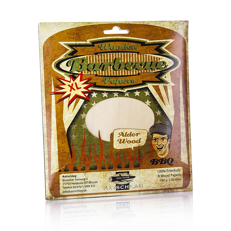 Rinde von der Erle - Man benutzt die Wood Paper Wraps, anstatt Alufolie oder Backpapier, auf dem Grill oder im Backofen. Vor dem Benutzen sollten sie zuvor 20 Minuten in Wasser oder eine andere aromatische Flüßigkeit eingelegt werden. Sie sind zur Zubereitung wie auch zum Servieren von Speisen geeignet. Durch leichtes Anbrennen der Rinde erhalten weißes Fleisch, Geflügel, Fisch, und andere stärkehaltige Gemüse ein angenehm rauchiges Aroma.