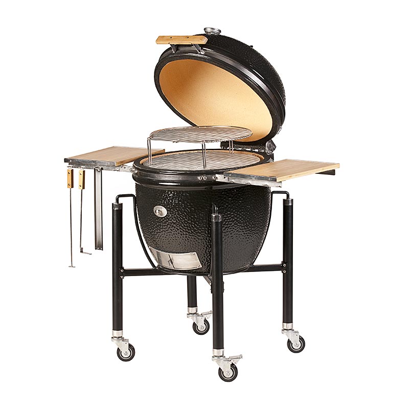 Das Set 2016 besteht aus Monolith Grill Classic, Black Seitenablagen aus verzinktem Stahl und Bambus Gitter für 2. Ebene Deflektorstein geteilt & Distanzstück Pittzzastein Räucherschiene mit Schieber Kohlekorb geteilt Feuerhaken gesamt Breite: 135cm, Seitenablagen eingeklappt 81cm Tiefe: 81cm Höhe: 128cm Rost: 57cm