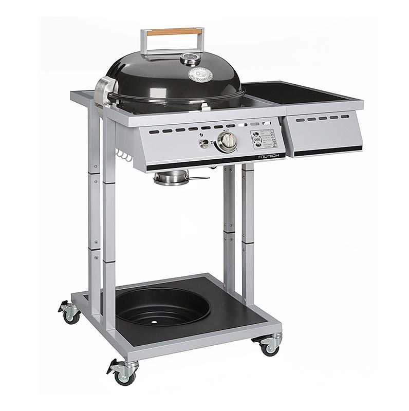 Ausstattung: Einzelringbrenner, 5,4 kW Leistung.; elektrische Mehrfachzündung (inkl. Batterie); Seitenablage mit Granitabdeckung; emallierte Teile: Ringbrenner, Trichter, Grillrost und Kugel; Deckelscharnier für müheloses Anheben des Deckels; pulverbeschichtetes Fahrgestell mit vier arretierbaren Lenkrolle; Thermometer; 4 Besteckhalter; Bodenrost mit spezieller Glasflaschenvertiefung. Grillrost 45cm Ø. Arbeitshöhe: 88cm.