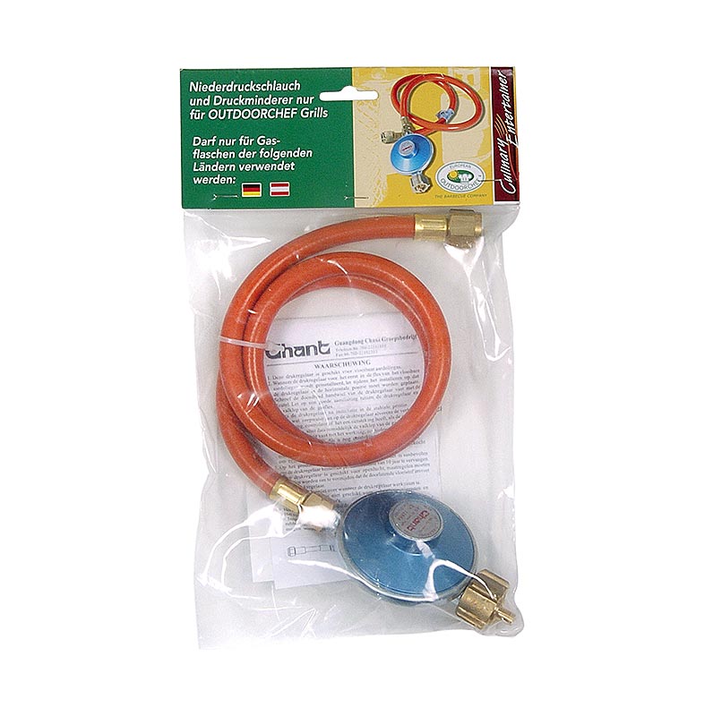 Das Set umfasst Niederdruckschlauch (90cm lang) und Druckminderer (50mbr) für alle Outdoorchef Gasgrills (Modelle ab 2011) - für sicheres Grillen mit Gas.