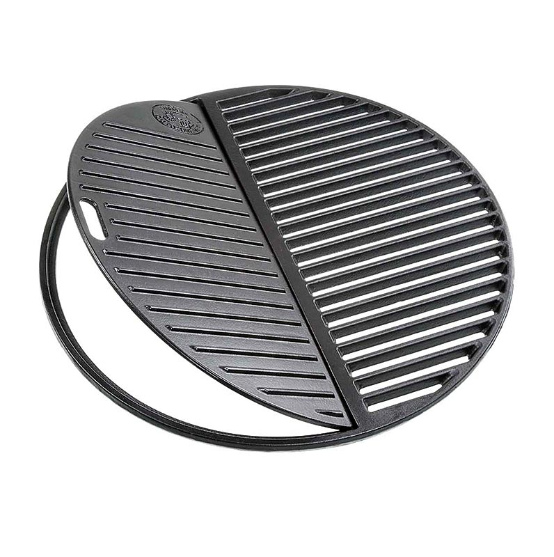 Gusseiserner Grillrost für die typischen Grillstreifenbildung des Garguts. Das Besondere an der 2-Teiligen Version ist die Geschlossene, klappbare Seite, auf der schmalere Lebensmittel wie Spargel, kleingeschnittenes Gemüse oder Eierspeisen gegart werden können, ohne dass diese durchlaufen können.