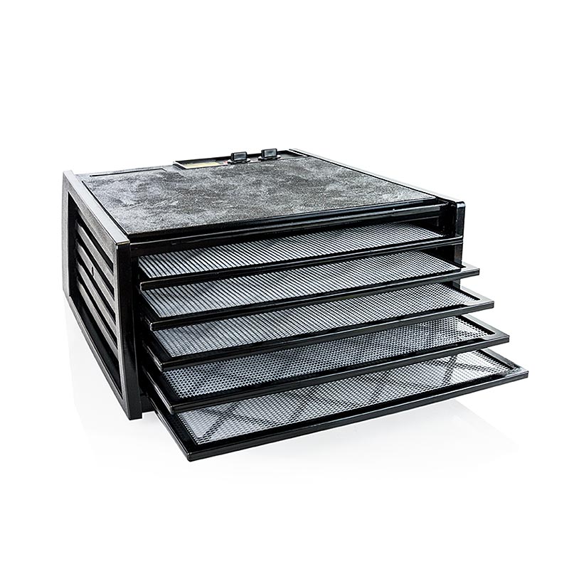 Trocknen in Rohkost-Qualität (unter 40° C). Riesige Kapazität und gleichmäßiges Trocknen. Wer nicht nur Trockenfrüchte, sondern auch rohköstliches Gebäck herstellen möchte, schwört auf den Excalibur-Trockner. Sein horizontaler Luftstrom erlaubt es z. B. Fruchtpürees fein auszustreichen und zu Fruchtleder zu trocknen. Der starke Lüfter gewährleistet eine besonders gleichmäßige Trocknung, ohne dass Sie immer wieder die Gitter tauschen müssen. Generell ist die Temperatur zwischen 30° und 70° verstellbar. Trockenfläche je Einschub: 1.296 cm²; Ausmaße: 42x49x22cm (BxTxH); Gewicht: 10 kg; 240 V, 600 Watt; 6 Monate Gewährleistung bei Gewerbl.Nutzung