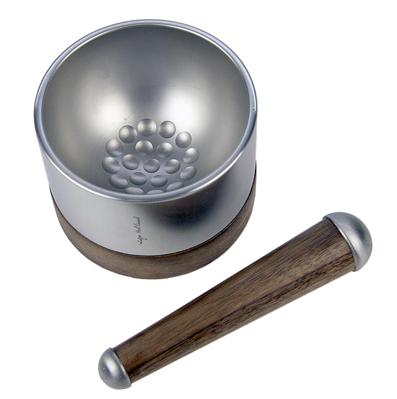 Sehr hochwertiger und funktioneller Mörser aus Edelstahl und mit Walnussboden. Der Mörser ist sehr schwer, daher ist leichtes Arbeiten möglich, die angefräste Arbeitsmulde erreicht angenehm einfaches Zerkleinern und ist sehr leicht zu pflegen. Der Stössel liegt gut in der Hand und ist ebenfalls aus Edelstahl und Walnussholz gefertigt. Der Ingo-Holland-Schriftzug befindet sich auf dem Edelstahlkörper.