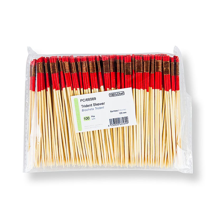 Bambus-Spieße, mit 3 Zacken, mit rot gefärbtes Ende, 9cm, 100% Chef, 100 St