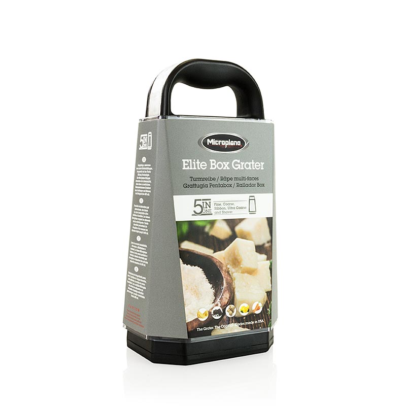 Kompakte Turmreibe im vierseitigen Design. Fünf verschiedene Klingenausführungen, Made in USA - fein, grob, sehr grob, 2-Wege und große Raspel. Griff und Füße sind aus rutschfestem Kunststoff und sorgen so für festen Halt beim Arbeiten. 2 Sichtfenster mit Markierungen bis 600 ml, auffangen und dosieren ein Schieber am Geräteboden ermöglicht ein sauberes und bequemes Arbeiten. Maximalen Komfort bieten ein rutschfester Boden und der Handgriff Einfach zu reinigen –fließendes Wasser reicht vielfach aus.