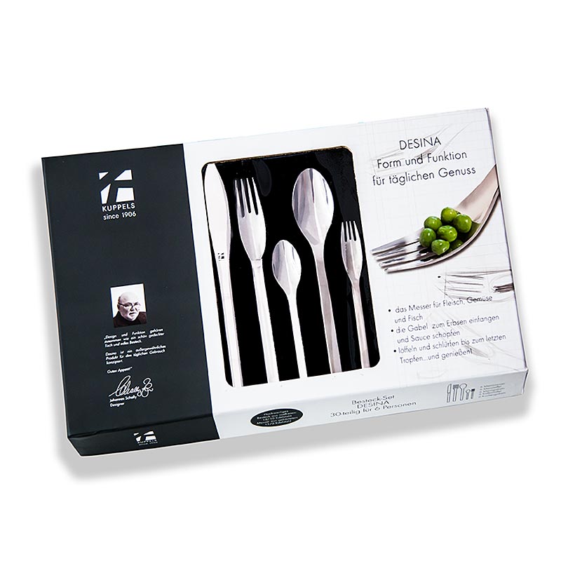 Hochwertiges Besteck aus rostfreiem 18/10-Edelstahl, Messer aus gehärtetem 13/0 Edelstahl, spülmaschinengeeignet. Bei den Messern wird lt. Hersteller geraten diese per Hand zu spülen. 30 Besteck-Teile: 6 Menümesser, 6 Menülöffel, 6 Menügabeln, 6 Kaffeelöffel, 6 Kuchengabel.