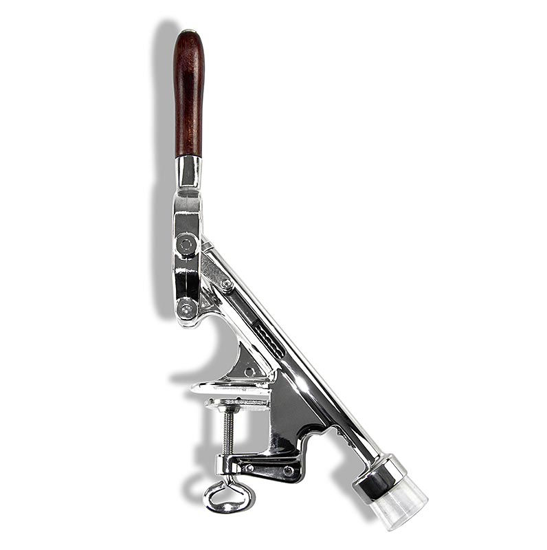 Für Profis: Die Entkorkmaschine "Cedon" in hochwertiger Zinkdruckguss-Ausführung und vernickelt. Mit der Klemmvorrichtung wird das Gerät an der Tischplatte befestigt. Mit zwei Handgriffen lassen sich Weinflaschen ganz leicht entkorken. Dieses ist die schwere Version (ca.2,5 kg) für den harten professionellen Einsatz. Siehe auch Artikel 33118.