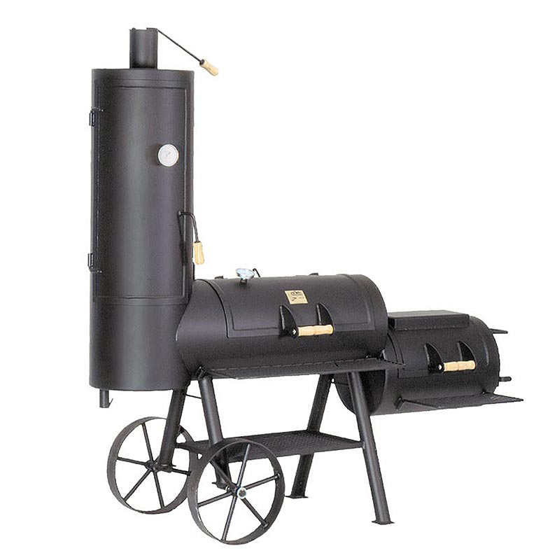 Joes Barbecue 16" Chuckwagon: 200x90x200cm, Gewicht 260 kg - 3 Ablagen: am Kamin, vor der Garkammer & Feuerbox und Holzablage unter Smoker - Kochplatte auf der Feuerbox - 2 Thermometer zur Innenraummessung - Grillroste in Garkammer und Feuerbox - 5 Rundroste zum Garen und Räuchern im Kamin, ø 40cm - Schwenkarm-Halterung für Gusseisentöpfe - Ablauf für Flüssigkeiten im Kaminboden - Grillflächen: 100x40cm Garkammer, 50x40cm Feuerbox - Massive Eisenräder; Halterung für Seitenarbeitstisch