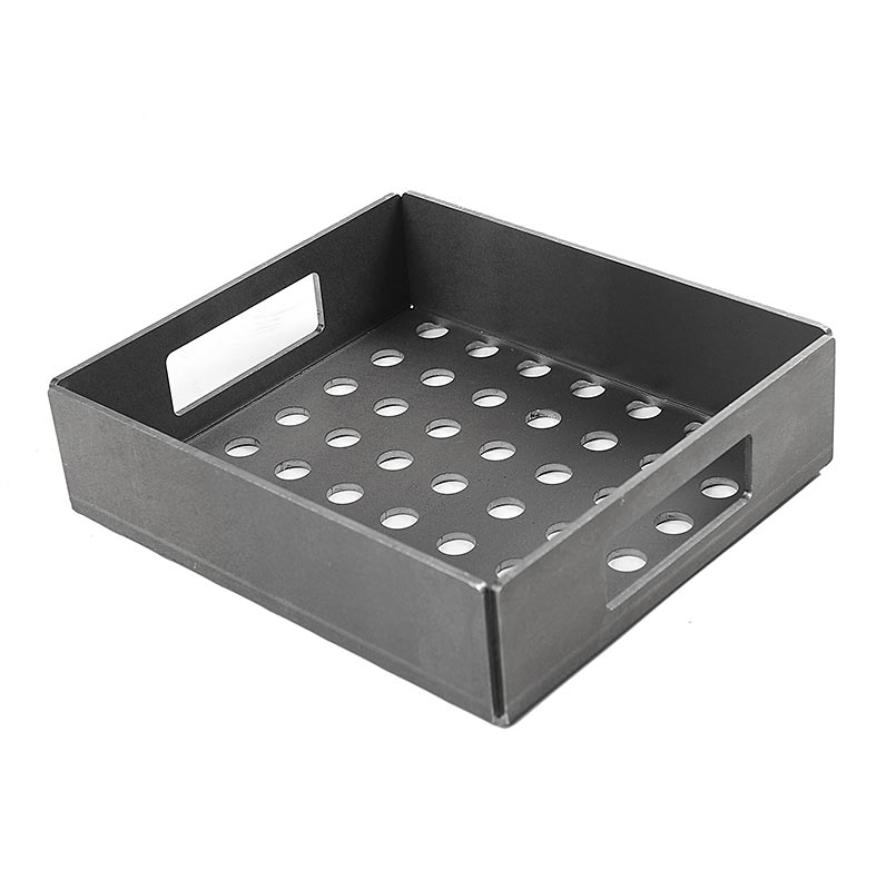 Wenn Sie direkt mit Holzkohle, statt mit Feuerholz, in Ihrem Smoker arbeiten wollen, dann empfielt sich dieser Einsatz aus Edelstahl. Die hochgezogenen Seitenwände halten die Holzkohle beisammen und die beiden Griffaussparungen erleichtern das Hantieren. Maße 31x28x8cm