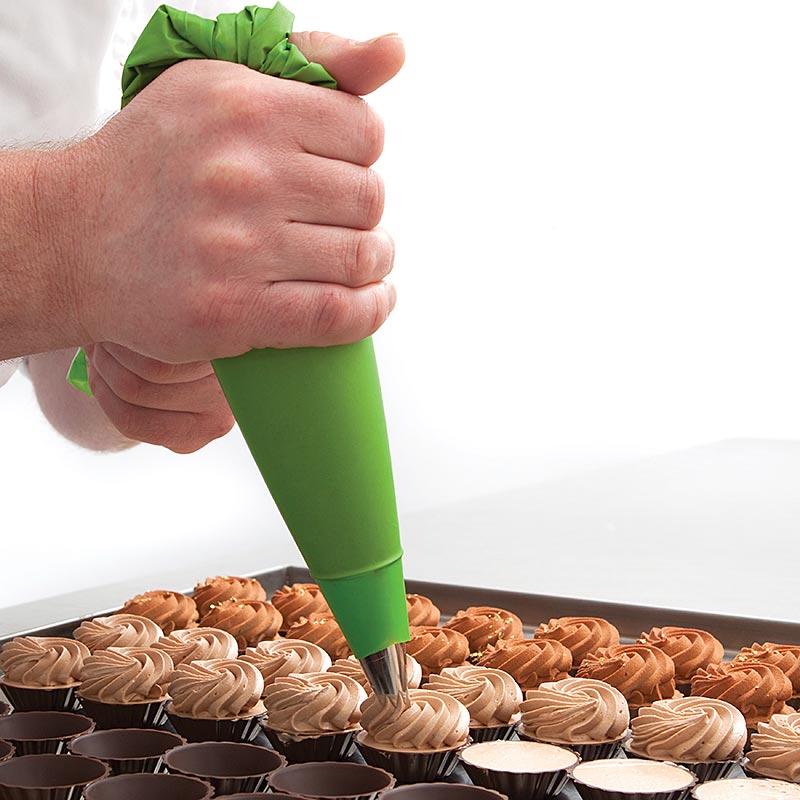 One Way Spritzbeutel haben 4 Lagen, (außen Gummi „Soft Touch" Gefühl) - lassen sich ohne Beschädigung trennen - sind sehr gebrauchsfreundlich - platzen nicht - haben eine verstärkte Naht - sind in verschiedenen Größen erhältlich - für kalte Masse und Schlagsahne